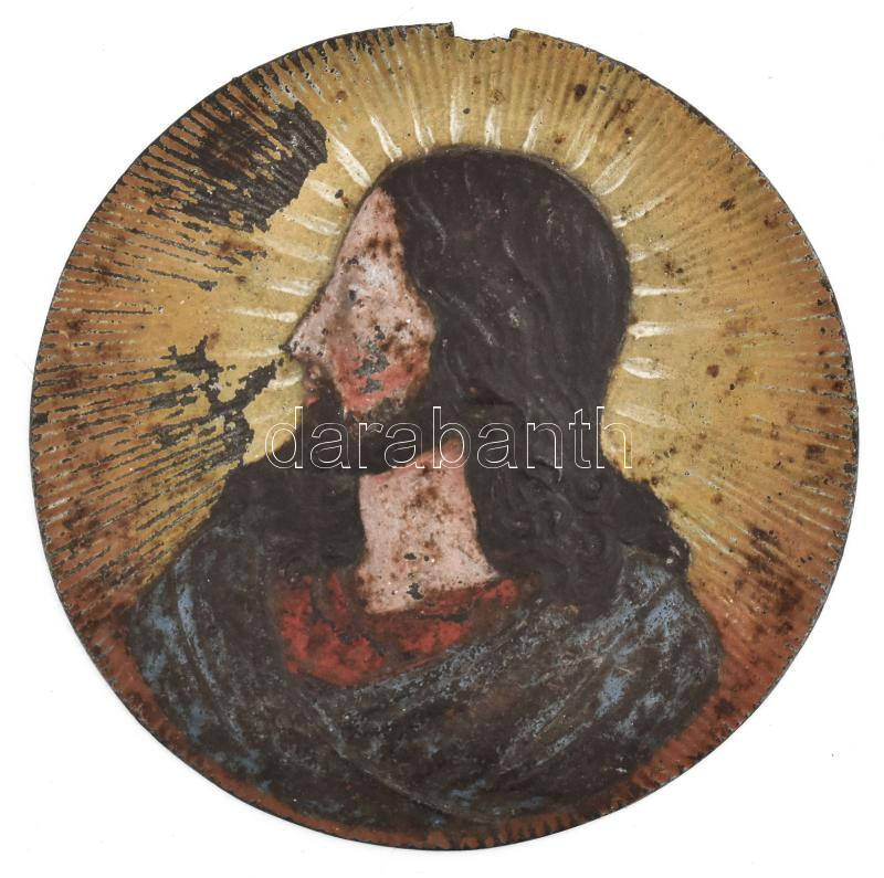 Leírás: Festett vas Krisztus plakett, kis sérüléssel d: 10 cm