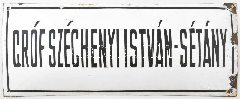 Leírás: "Gróf Széchenyi István-sétány", régi zománcozott fém utcatábla, szélén kisebb zománcsérülésekkel, 50x20 cm