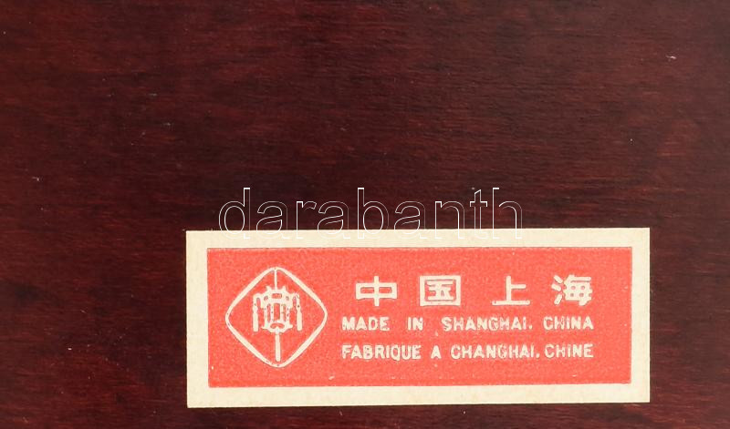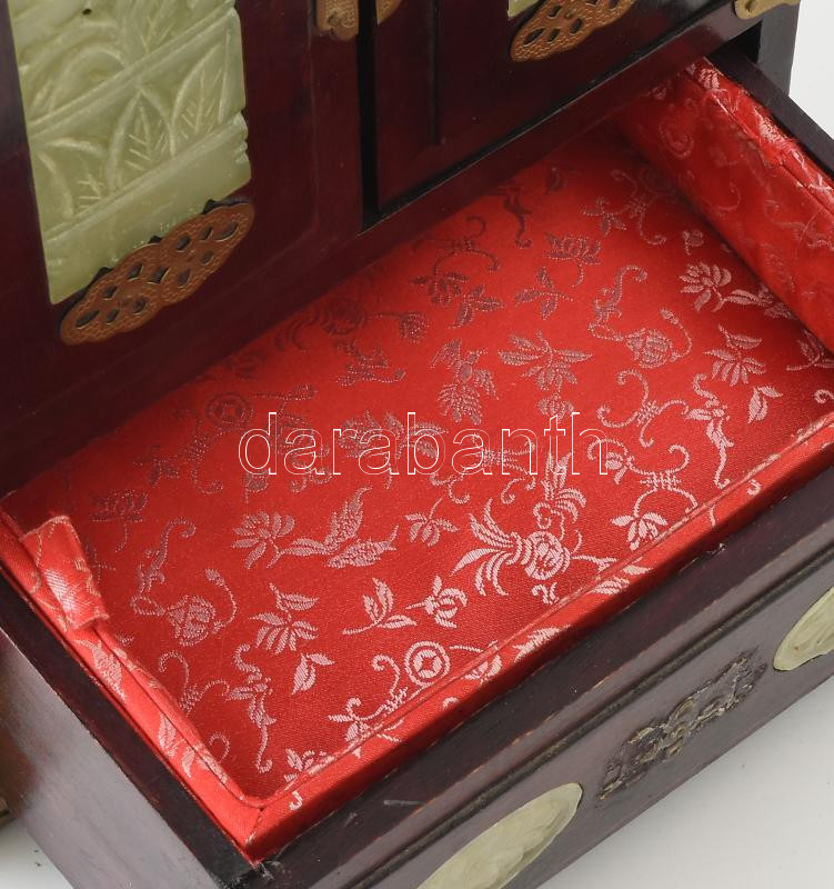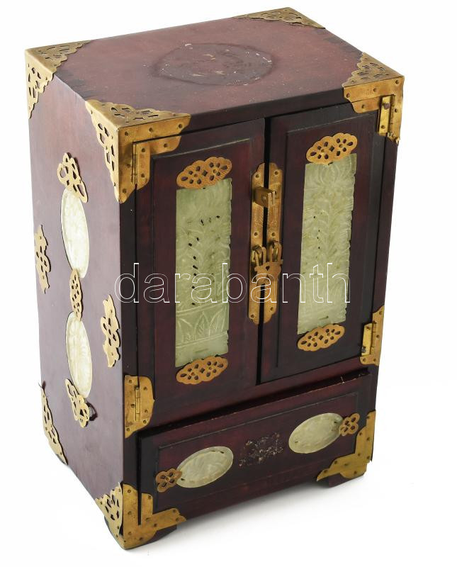 Leírás: Kínai ékszeres szekrény, réz veretekkel és faragott jáde(?) berakásokkal, hiányokkal, pótlásokkal. Alján címkével jelzett, 31x20x15 cm