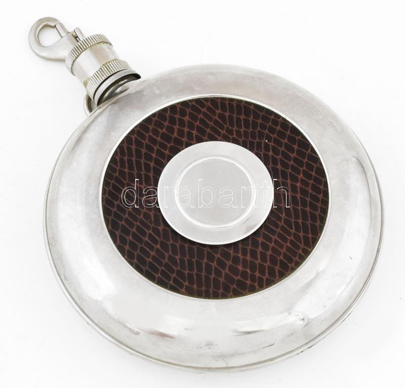 Leírás: Kiránduló flaska, fém, bőr betéttel, kiszedhető kupicával d: 12 cm