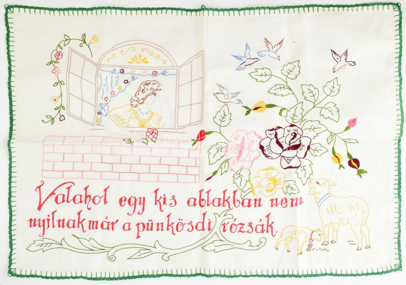 Leírás: Régi konyhai falvédő: "Valahol egy kis ablakban nem nyílnak már a pünkösdi rózsák". 52x75 cm