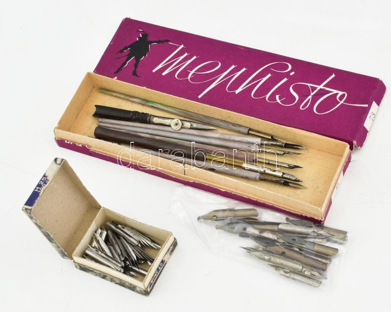 Leírás: Régi tollhegyek, rajztoll és töltőtoll hegyek részben eredeti dobozában