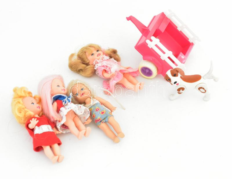 Leírás: Mattel 4 db baba, utánfutó, kutya. H: 9-12 cm