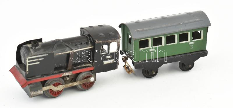 Leírás: cca 1950 Lenkerekes fém játék mozdony és kocsi 25 cm együtt kissé kopott