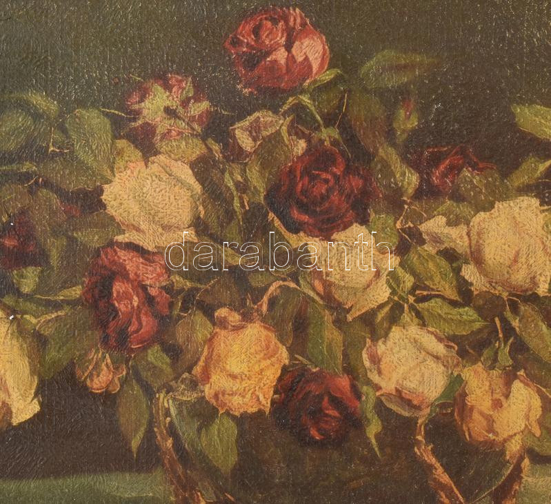 Szecessziós, antik, kissé sérült fakeret, csendélet nyomattal kartonon, jelzett a nyomaton, hátoldalán Könyves Kálmán Műkiadó 1910 köröli címkéjével, belső méret: 38,4×56,2 cm
