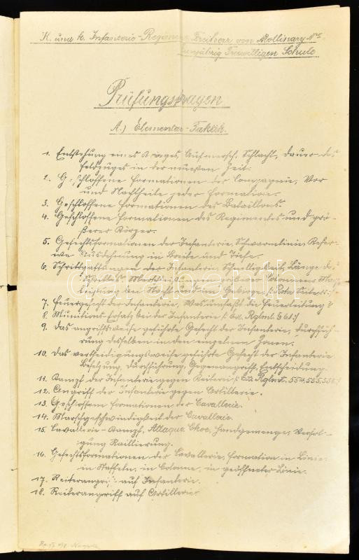 1896 K. u. K. Infanterie-Regiment Freiherr Von Mollinary Nr. 38. Einjährig Freivilligen Schule Feldienst Fragen ... Stencilezéssel sokszorosított katonai iskolai kérdéssor, hajtott, 4 sztl. lev.
