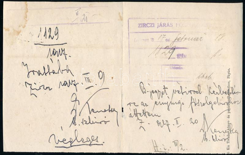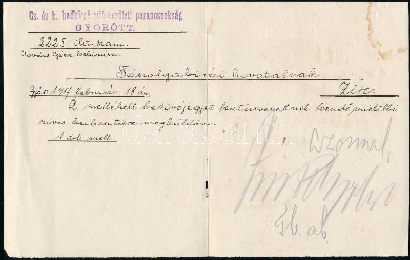 Leírás: 1917 Győr, behívójegy kézbesítéséről katonai dokumentum