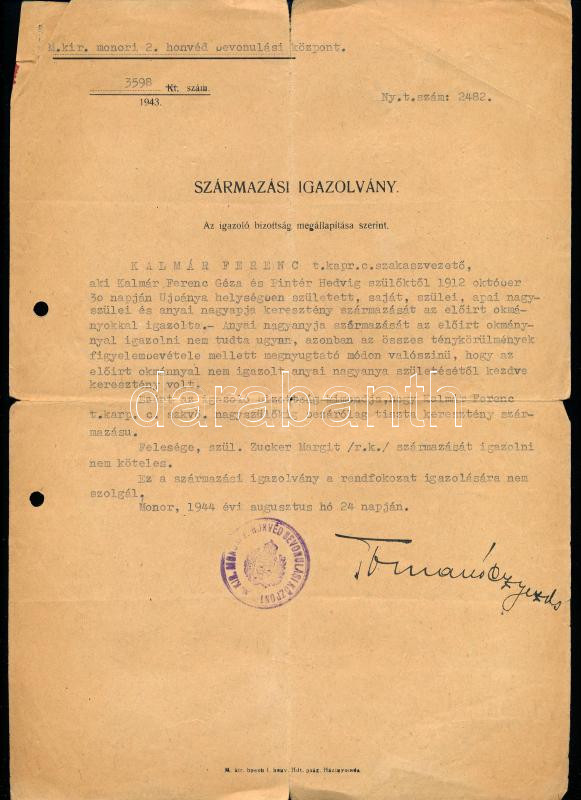 1944 Monor, szakaszvezető számára kiállított származási igazolvány https://www.darabanth.com/hu/450-Gyorsarveres/450.0/Mutargy-papirregiseg-egyeb/Militaria~1000001/1944-Monor-szakaszvezeto-szamara-kiallitott-szarmazasi-igazolvany~II2993849