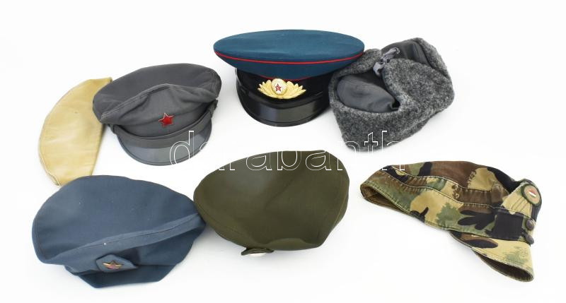 Leírás: 7 db szovjet és magyar katonai sapka (gyakorló- és tányérsapkák, usanka), különböző méretben és állapotban
