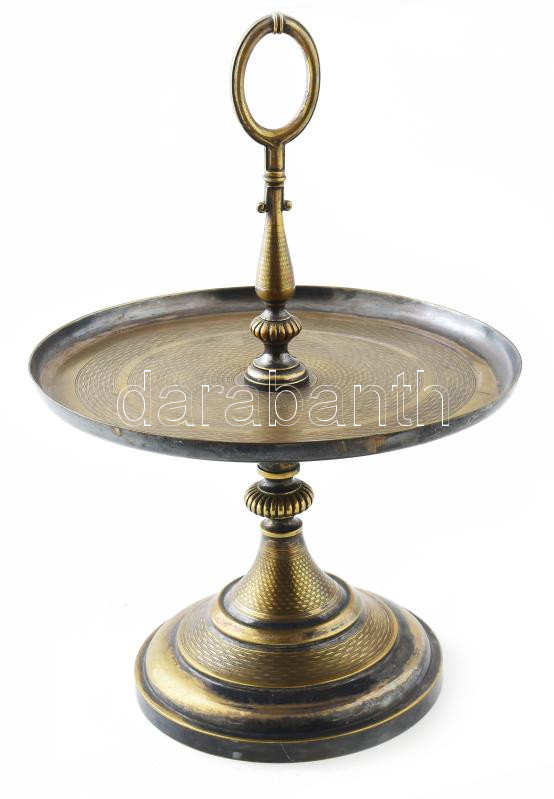 Leírás: Antik ezüstözött alpakka talpas kínáló, kissé billeg, jelzés nélkül, kopással, m: 35 cm