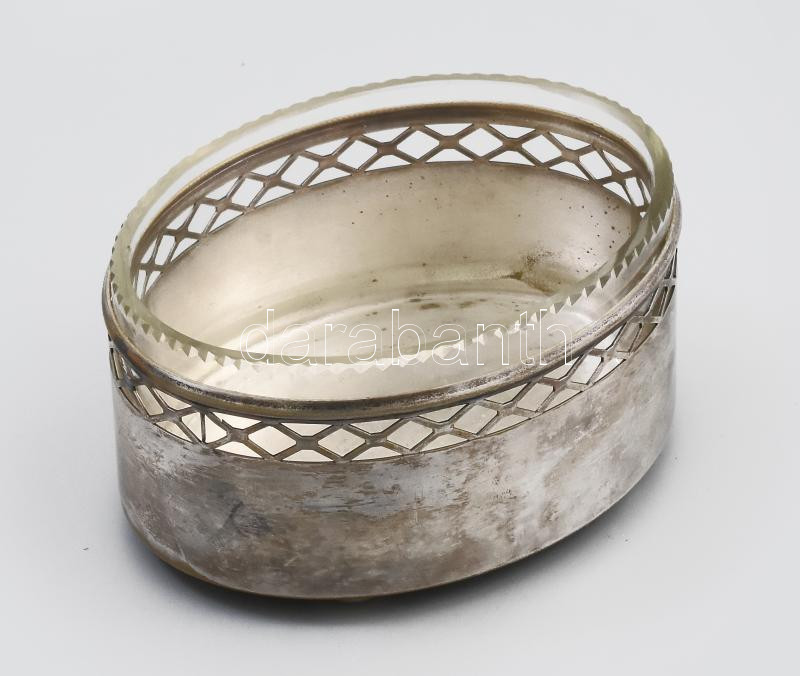 Leírás: Antik ovális bonbonier, ezüstözött réz, üveg, 4 félgömb lábon, üvegbetéten pattanással, fém részén kopással, 12,5x9,5x7 cm