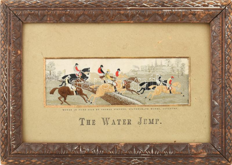 Ugratás a víz felett (The water jump)). Stevengraph, szövött selyemkép, paszpartun jelzéssel, 5×15 cm. Dekoratív sérült fakeretben., XIX. sz. második fele / pure silk woven picture, Thomas Stevens, Stevengraph Works, Coventry