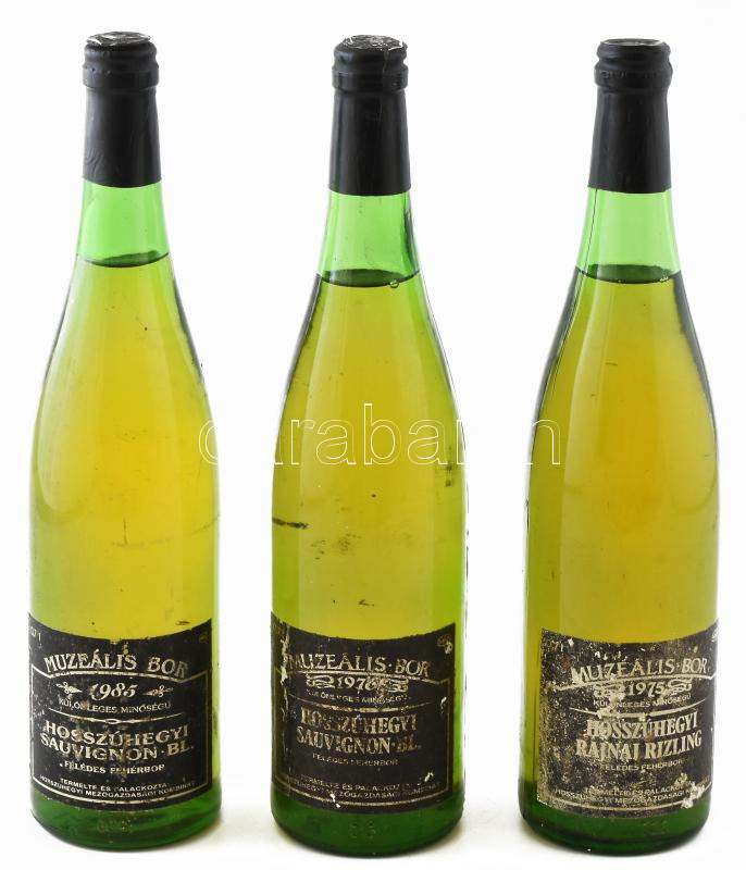 Leírás: 1975-1976-1985 Hosszúhegyi válogatás, Hosszúhegyi Savignon Bl[anc] 1976, 1985 és Hosszúhegyi Rajnai Rizling 1975, 3 palack muzeális bor, hajós-bajai borvidék, pincében, szakszerűen tárolt bontatlan palack fehérbor, kopott, kissé sérült címkékkel, 0,75lx3