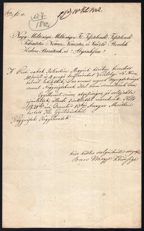 Leírás: 1841 Bars vármegye hivatalos levele a Pesti Vakok Intézetének gyűjtött pénzről