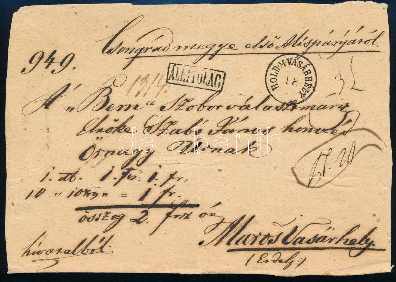1870 Csongrád megye első Alispányáról A "Bem" Szoborválasztány Elnöke Szabó János honvéd őrnagy úrnak, Marosvásárhely, boríték fedlapja, "Holdm[ező]vásárhely" bélyegzéssel.