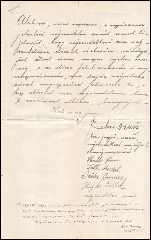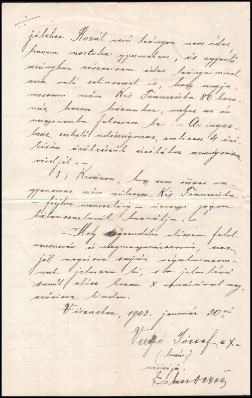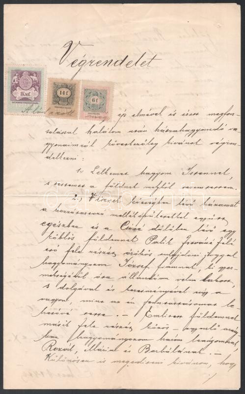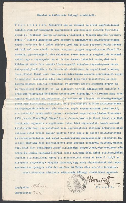 Leírás: 1903 Visznek, Vágó József huszár végrendelete, okmánybélyegekkel + gépelt másolat