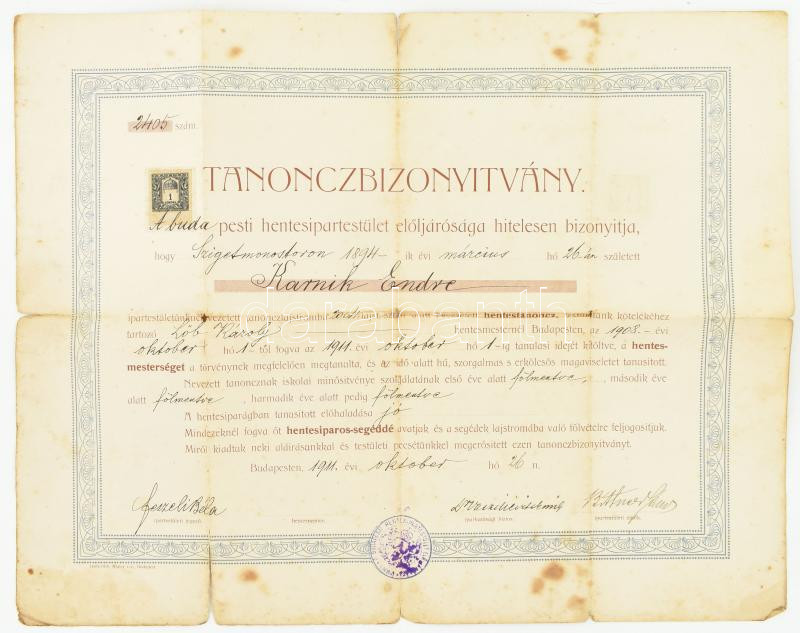 Leírás: 1911 Hentes tanoncbizonyítvány: 43x34 cm Kissé szakadozott a hajtásoknál