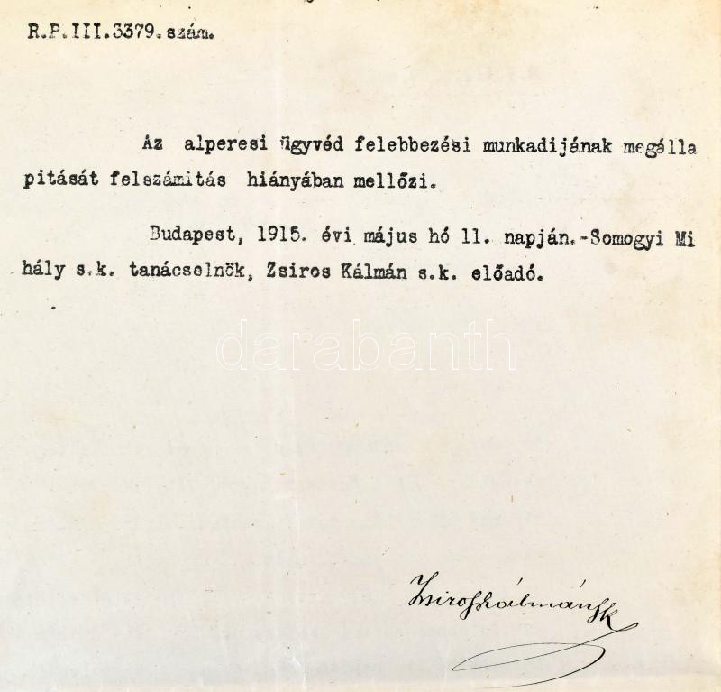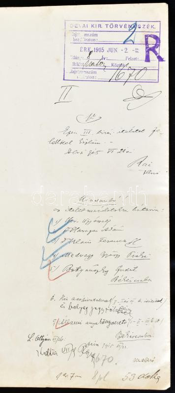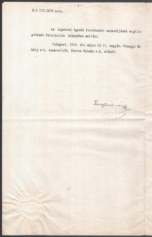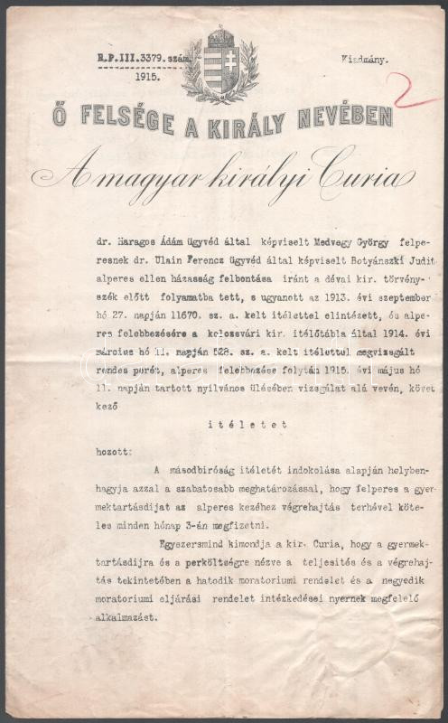 1915 Déva, A M. Kir. Curia gyermektartdíj ügyében kiállított ítélete, fejléces, koronás - tölgyfaleves nemzeti kiscímerrel, a M. Kir. Curia papírfelzetes viaszpecsétjével, 4 p.
