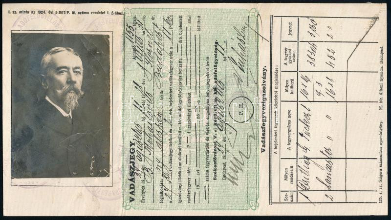 1927 Vadászjegy és fegyverigazolvány, fényképes, Bácsszentiváni Michailovits Kornél ny. Bácsbodrog vármegyei alispán részére kiállítva, szép állapotban