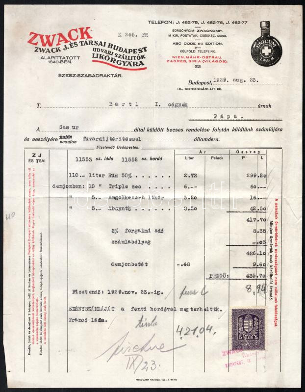 1929 Bp., Zwack J. és Társai udvari szállítók Likőrgyára fejléces szám... https://www.darabanth.com/hu/450-Gyorsarveres/450.0/Mutargy-papirregiseg-egyeb/Okmanyok~500022/1929-Bp-Zwack-J-es-Tarsai-udvari-szallitok-Likorgyara-fejleces-szamla~II2988426