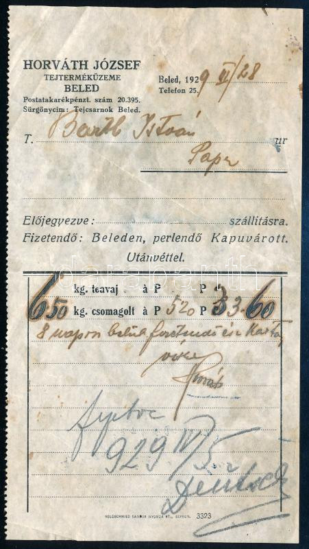 Leírás: 1929 Hortváth József - tejterméküzem, Beled szállítójegyzék