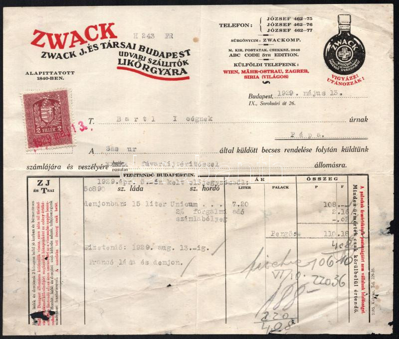 Leírás: 1929 Zwack J. és Társai udvari szállítók Likőrgyára fejléces számla
