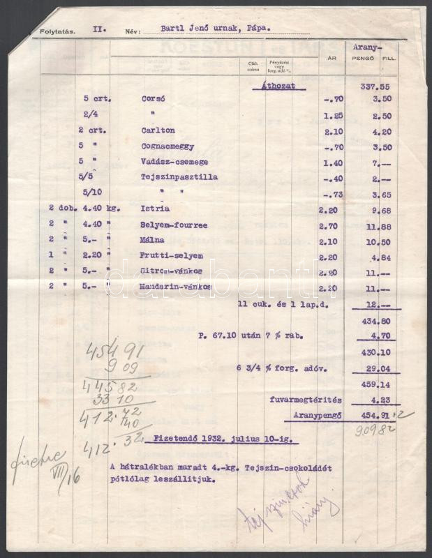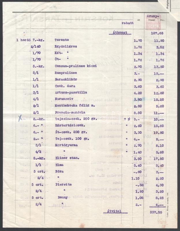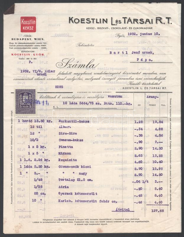 Leírás: 1932 Koestlin L. és Társai Keksz-, Biszkvit- és Csokoládégyár, Győr dekoratív 3 oldalas /52 tételes/ fejléces számla