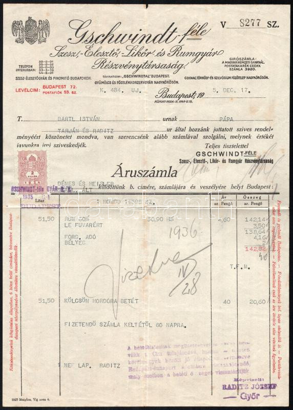 1935 Bp., Gschwindt-féle Szesz,- Élesztő,- Likőr-és Rumgyár fejléces s... https://www.darabanth.com/hu/450-Gyorsarveres/450.0/Mutargy-papirregiseg-egyeb/Okmanyok~500022/1935-Bp-Gschwindt-fele-Szesz-Eleszto-Likor-es-Rumgyar-fejleces-szamla~II2988419