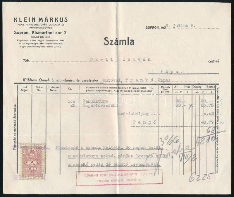 1938 Klein Márkus Papírzacskógyára, Sopron fejléces számla https://www.darabanth.com/hu/450-Gyorsarveres/450.0/Mutargy-papirregiseg-egyeb/Okmanyok~500022/1938-Klein-Markus-Papirzacskogyara-Sopron-fejleces-szamla~II2988117