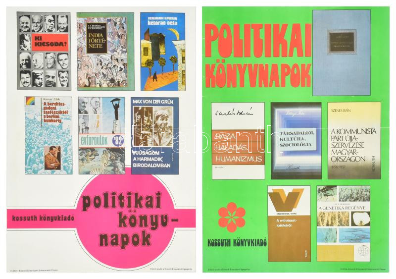 Leírás: cca 1982 Politikai Könyvnapok 2 db reklám plakátja, Bp., Kossuth, hajtott, 42x30 cm