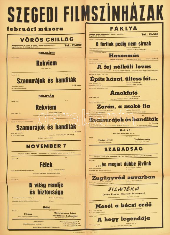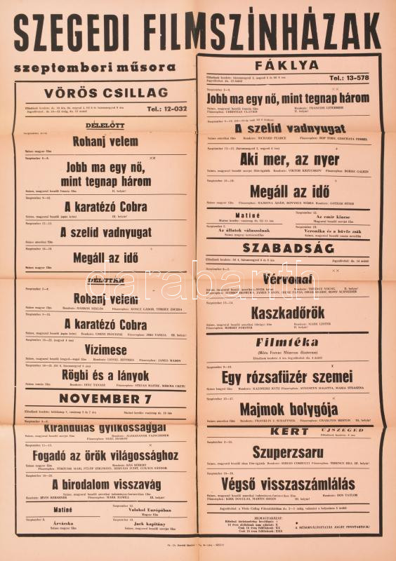 cca 1982 Szegedi filmszínházak februári és szeptemberi műsora, 2 db na... https://www.darabanth.com/hu/450-Gyorsarveres/450.0/Mutargy-papirregiseg-egyeb/Plakat~2000026/cca-1982-Szegedi-filmszinhazak-februari-es-szeptemberi-musora-2-db-nagymeretu-plakat-hajtv~II2991853