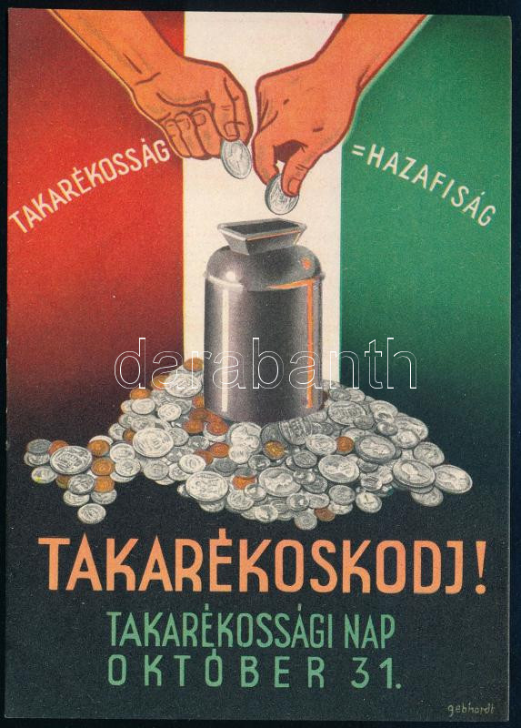Leírás: "Takarékoskodj!" Reklám a takarékossági napról, október 31.-éről. Gönczi-Gebhardt Tibor grafikája 13,5x9,5 cm.