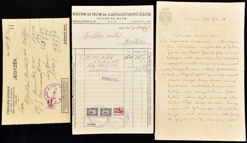 Leírás: cca 1940 baja 2 db számla és egy fejléces levél céges reklámokkal