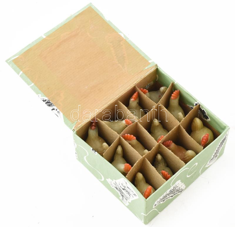 Leírás: 12 db kínai jáde kakas figura, eredeti dobozában egyenként m:4 cm