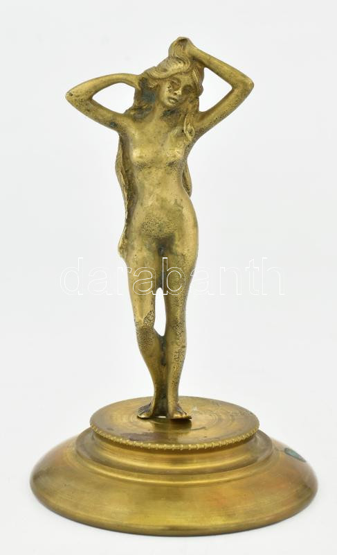 Leírás: Antik bronz női akt szobor, talapzaton, jelzés nélkül, kopottsággal, m: 17 cm
