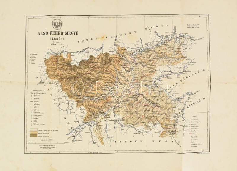 Leírás: 1888 Gönczy Pál - Kogutowicz Manó: Alsó-Fehér megye térképe, 1 : 300.000, Bp., Posner Károly Lajos és fia, kis sérülésekkel, foltokkal, 58x45 cm