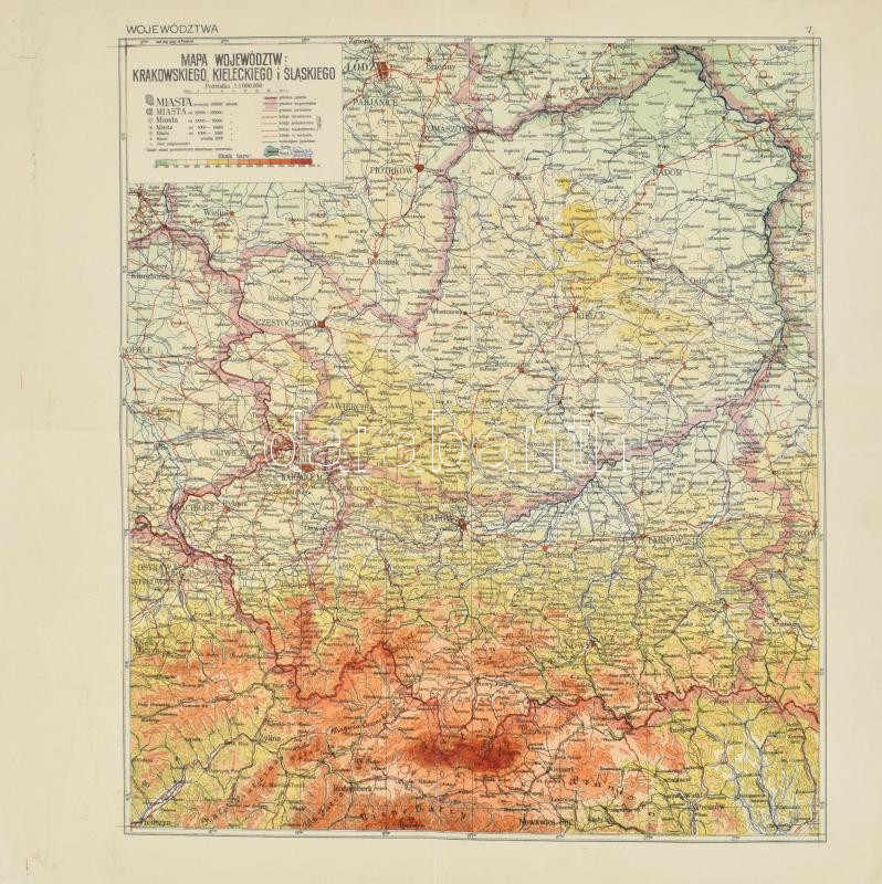 cca 1930 Mapa Województw: Krakowskiego, Kielickiego i Slaskiego / Lengyelország vajdaságainak térképe (Krakkói, Kielcei, Sziléziai), 1 : 1.000.000, néhány kis lapszéli szakadással, 38x38 cm