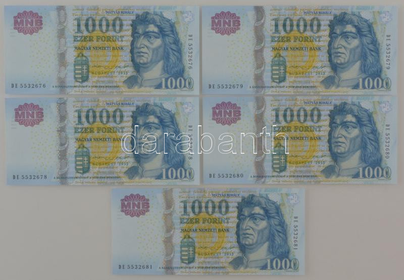 Leírás: 2015. 1000Ft (5x) sorszámkövetők és közeli sorszámok "DE 5532676 - DE 5532681" T:UNC,AU