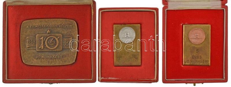 1958. "Filmszakmában végzett jó munkáért - 1948-1958" öntött bronz emlékplakett eredeti tokban (73x59mm) + ~1970. "Fővárosi Autótaxi Vállalat 5 éves jó munkáért" bronz plakett eredeti tokban, jelvénnyel (35x52mm) + ~1970. "Fővárosi Autótaxi Vállalat 10 éves jó munkáért" bronz plakett eredeti, sérült tokban (35x52mm) T:XF