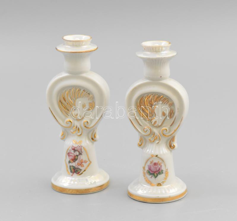 Leírás: Porcelán gyertyatartó pár lovas mintával, matricás, jelzett, kopással, m: 14,5 cm