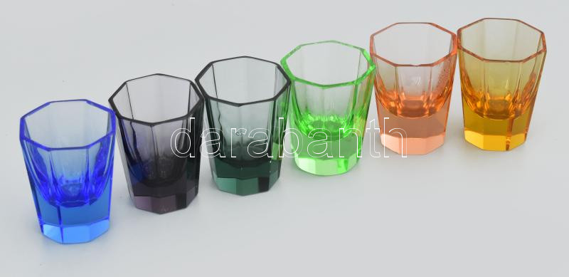 Leírás: 6 db Moser jellegű színes pohár, kupica. Anyagában színezett, egy-két minimális lepattanással 6 cm