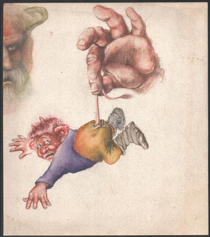 Leírás: Jelzés nélkül: Az ördög fia. Akvarell, ceruza, papír. A lap szélén kisebb törésnyomokkal, foltokkal, 32x28 cm
