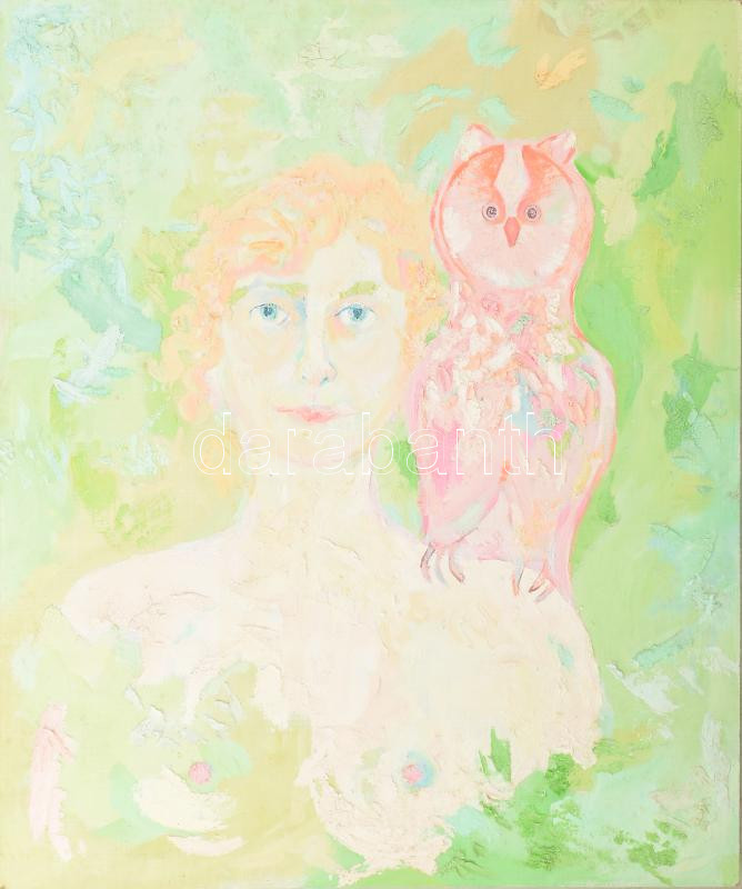 Leírás: Jelzés nélkül: Női akt bagollyal. Olaj, farost. 60x50 cm