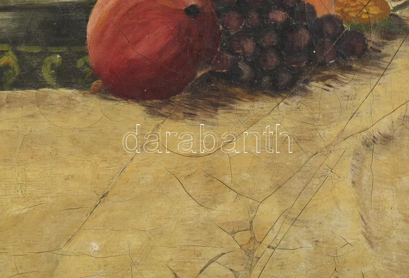 Leírás: Jelzés nélkül, XX. sz. eleje: Csendélet gyümölcsökkel. Olaj, vászon, sérült. Dekoratív fakeretben. 45x60,5 cm