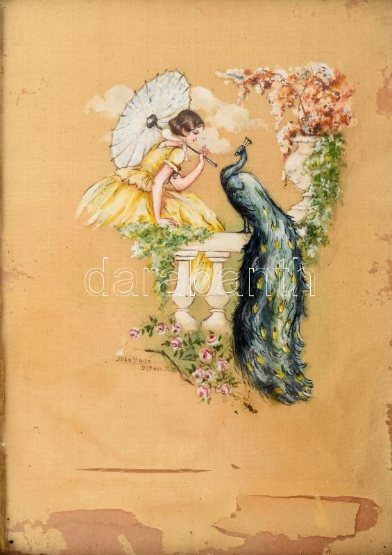 Leírás: Joláthyné jelzéssel: Napernyős hölgy pávával, 1927. Akvarell, selyem. Dekoratív. üvegezett, sérült fakeretben. 18x13 cm