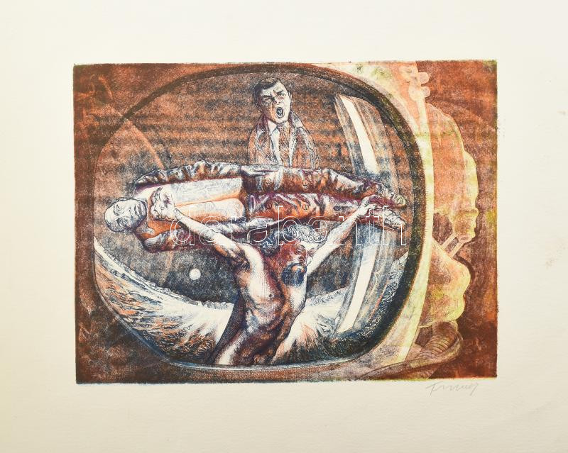 Leírás: Olvashatatlan jelzéssel, XX. sz. vége/XXI. sz. eleje: Szürrealista jelenet Jézussal. Vegyes technika (sokszorosított grafika), papír. 29x39,5 cm