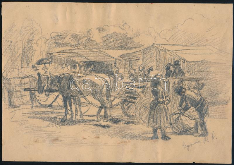 Leírás: Egerváry Potemkin Ágost (1858-1930): Vásári jelenet. Ceruza, ceruza, papír, jelzett, kétoldalas 20x28 cm