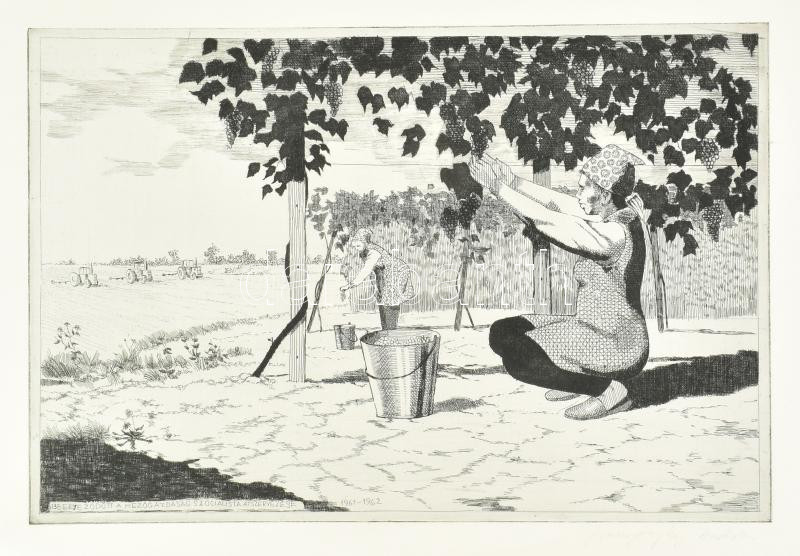 Leírás: Szunyoghy András (1946-): Befejeződött a mezőgazdaság szocialista átszervezése. Rézkarc, papír, jelzett. 24x36 cm
