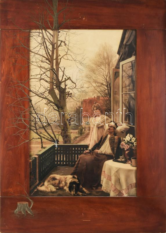 Leírás: cca 1900 A sebesült katona. Nagy méretű litográfia, a képhez illeszkedő faragott dekoratív fa keretben 50x77 cm, 80x110 cm