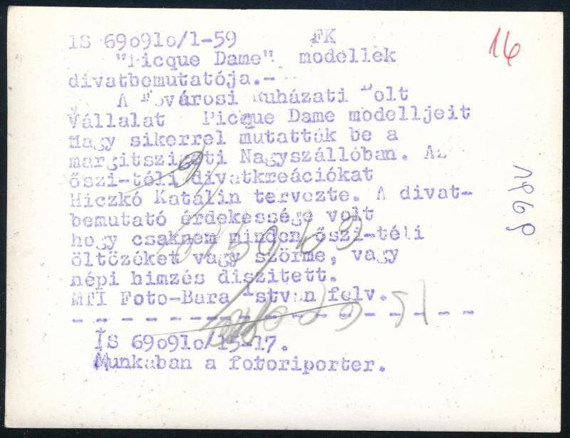 Leírás: 1969 "Picque Dame" modellek, hátoldalon feliratozott sajtófotó, 9×12 cm